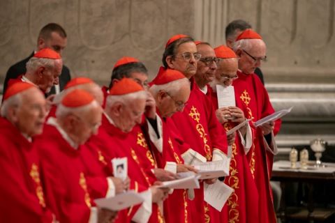 Các Hồng Y cử hành Thánh lễ vào Ngày 3 của Thánh lễ Novendiales dành cho Đức Giáo Hoàng Phanxicô vào ngày 28 tháng 4 năm 2025, tại Vương cung thánh đường Thánh Phêrô ở Vatican. Tín dụng: Daniel Ibañez/CNA